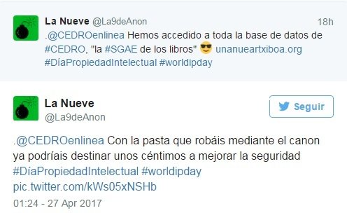 “Con la pasta que robáis mediante el canon ya podríais destinar unos céntimos a mejorar la seguridad”, así hacían público en su cuenta de Twitter que Anonymous hackeaba Cedro. En el tweet compartían dos pantallazos con datos de los socios de la organización.